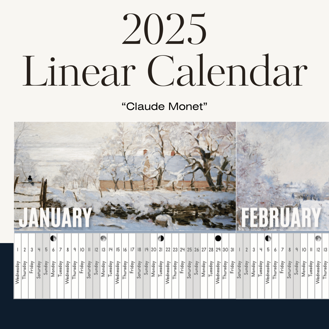 Make every month an artistic adventure with the 2025 Claude Monet Linear Calendar! Explore the beauty of each season through Monet’s masterpieces, while visually tracking the passage of time and connecting with nature’s changing rhythms.