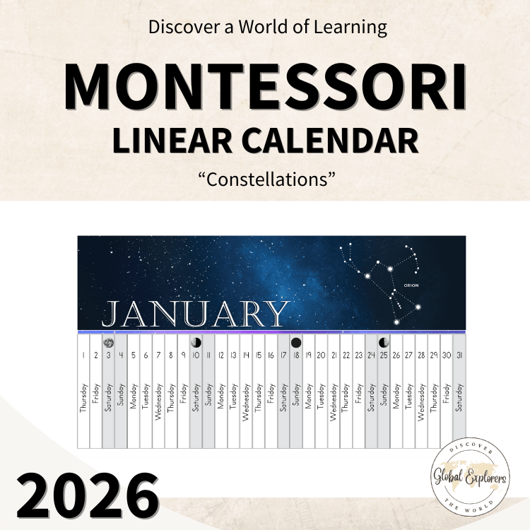 A Montessori linear calendar helps make the passage of time more concrete for children by allowing them to see the year unfold. Because the entire year is displayed in one continuous line, children can better understand how days, weeks, and months connect and easily count down to special events, holidays, and birthdays.