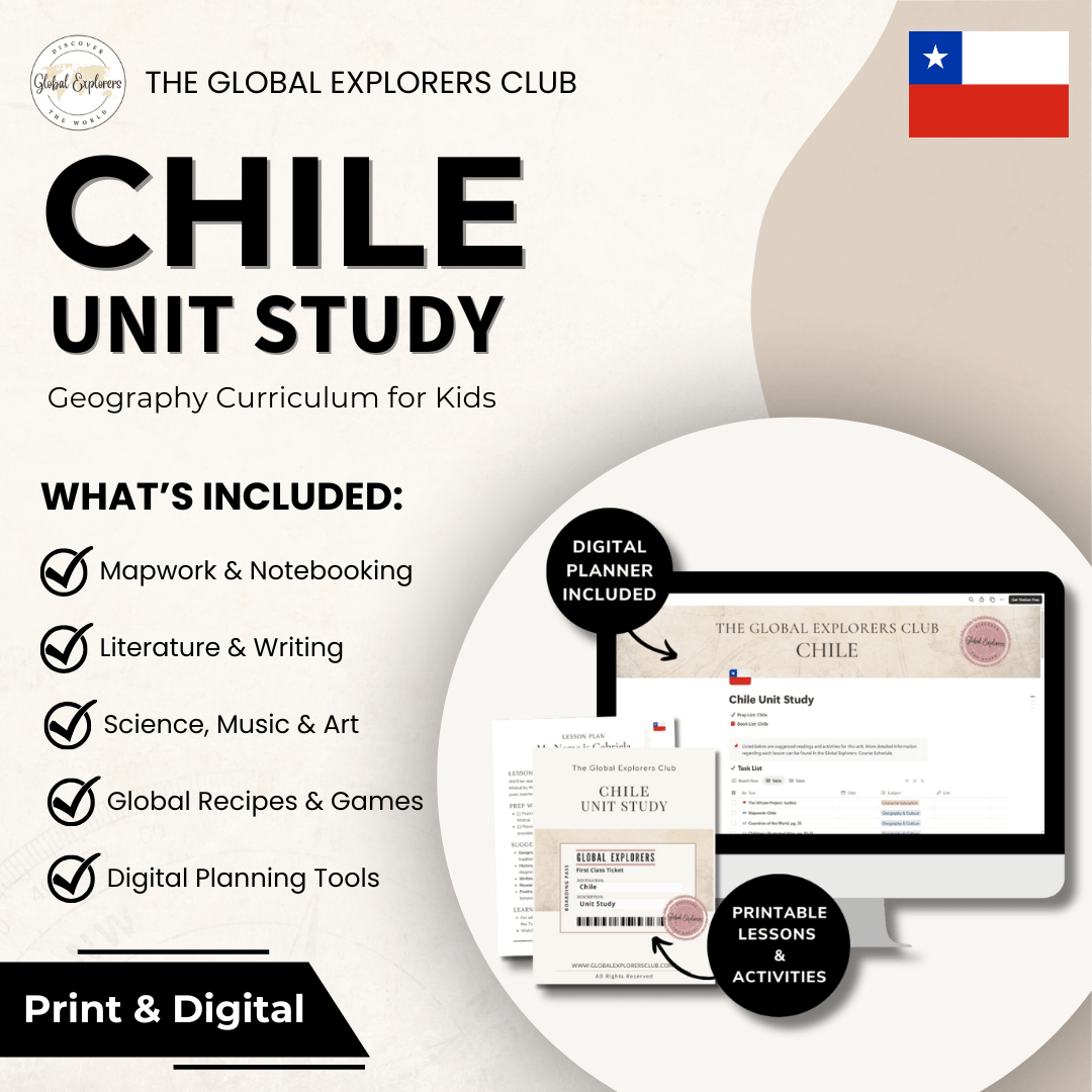 Explore the geography, culture, and traditions of Chile with this hands-on, literature-based unit study designed for Grades 1 to 6. Perfect for homeschool families, co-ops, classrooms, or Montessori continent studies, this resource combines mapwork, science, writing, and hands-on cultural activities for kids.