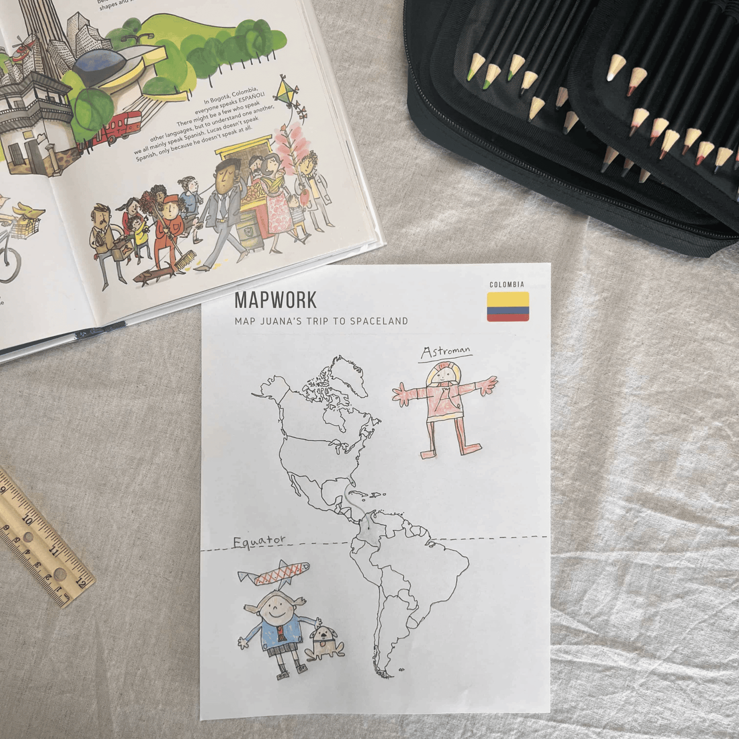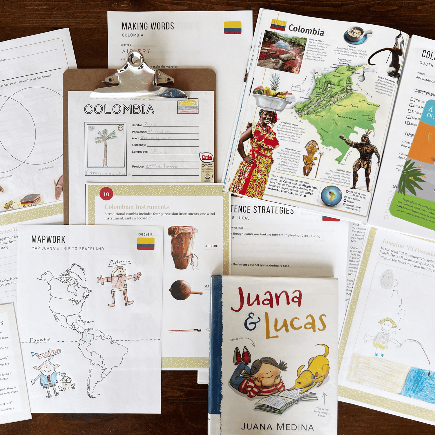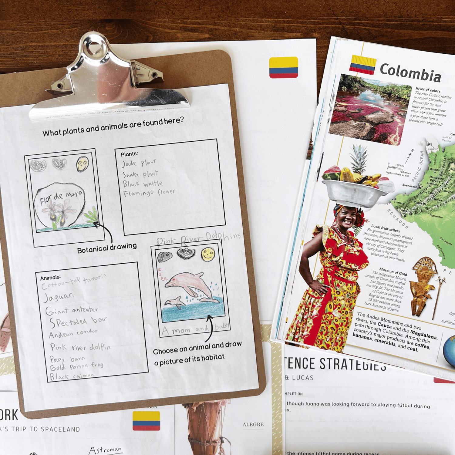 - Colombia Mapwork & Notebooking: Students label major cities, landforms, and cultural landmarks while customizing their own maps. Notebooking pages invite students to document facts, sketch discoveries, and color the national flag.