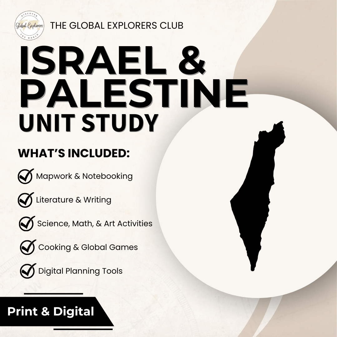 Discover the culture, geography, and traditions of Israel & Palestine with our hands-on, secular unit study. Designed for Grades 1 to 6, our literature-rich geography curriculum includes engaging activities in mapwork, science, writing, and hands-on cultural experiences, such as tatreez embroidery, buoyancy experiments, character education, cooking, and games. Perfect for homeschoolers, co-ops, classrooms, or Montessori continent studies.