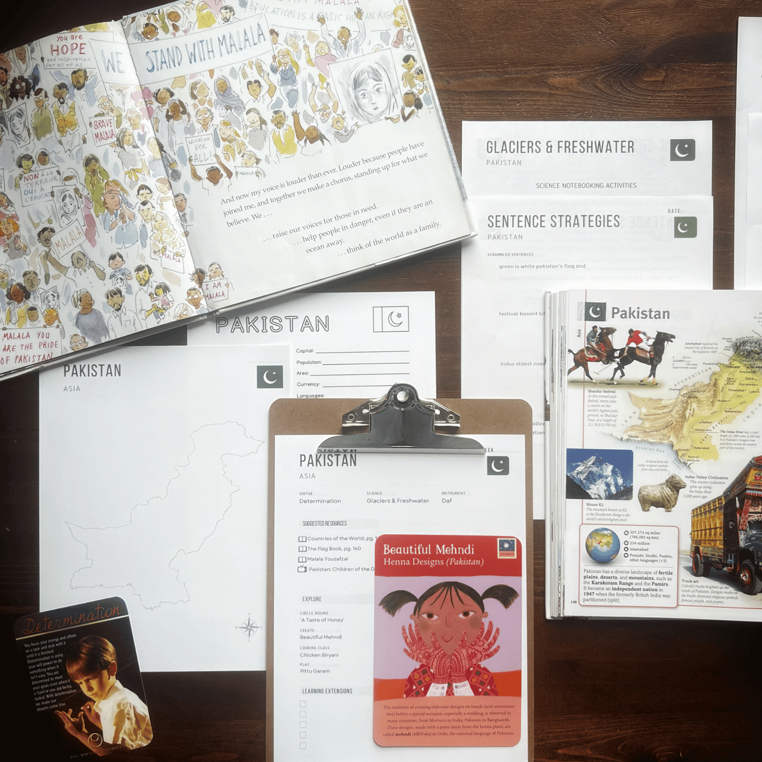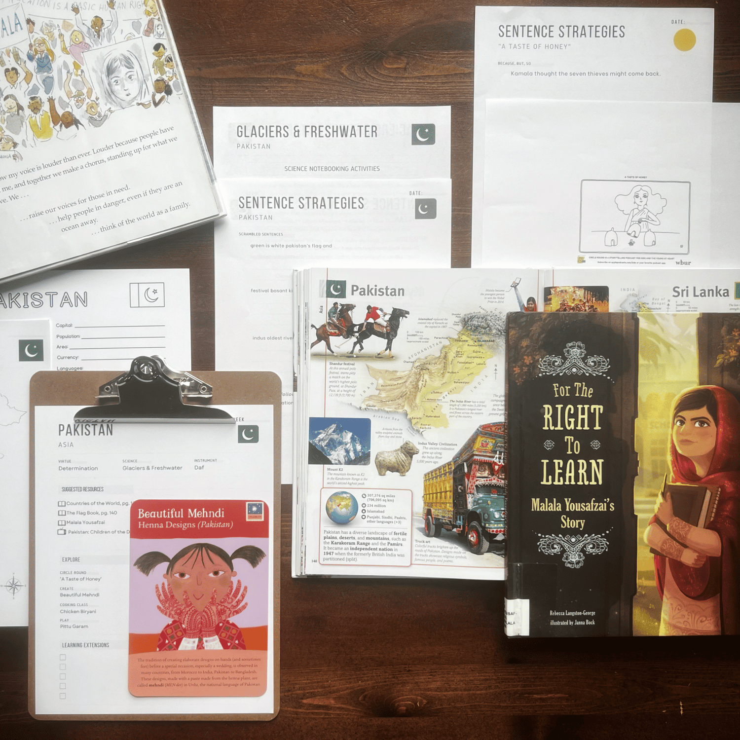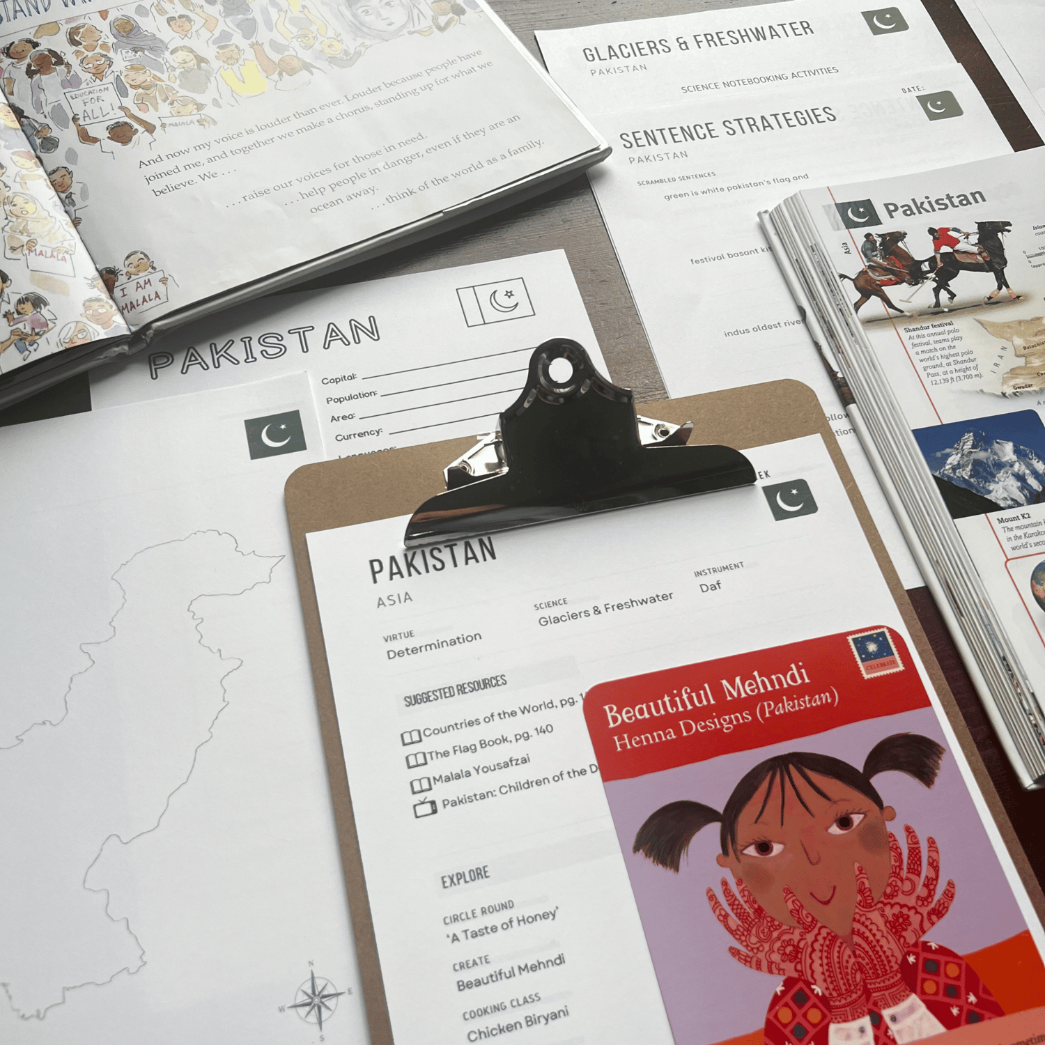 Learn about Malala Yousafzai’s courage, paint mehndi designs, explore Pakistan’s glaciers and freshwater systems, and cook chicken biryani. Perfect for homeschoolers, co-ops, classrooms, or Montessori continent studies.
