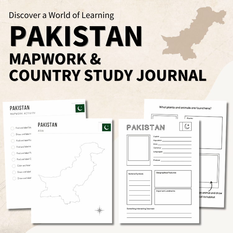 - Pakistan Mapwork & Notebooking: Students label major cities, landforms, and cultural landmarks while customizing their own maps. Notebooking pages invite students to document facts, sketch discoveries, and color the national flag.